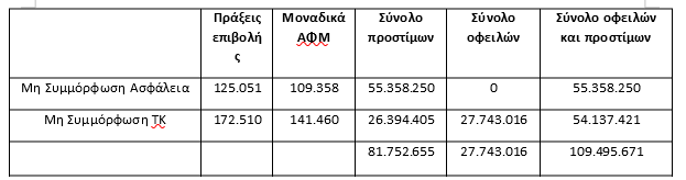 Συνολικά, τα πρόστιμα που επιβάλλονται για ανασφάλιστα οχήματα φτάνουν τα 55,3 εκατομμύρια ευρώ, ενώ για τις περιπτώσεις μη καταβολής τελών κυκλοφορίας τα πρόστιμα ανέρχονται σε 26,4 εκατομμύρια ευρώ και οι οφειλές τελών σε 27,7 εκατομμύρια ευρώ.