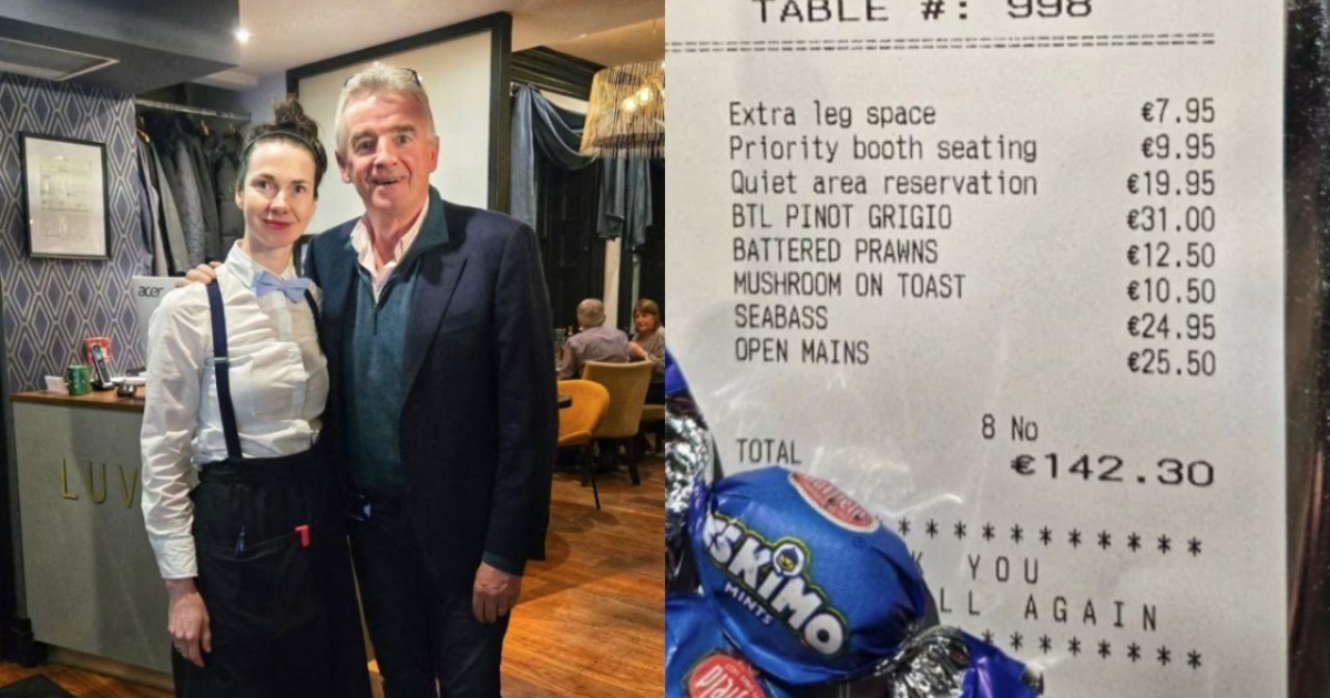 Ένας CEO της Ryanair βρέθηκε αντιμέτωπος με μια απρόσμενη φάρσα κατά την επίσκεψή του σε γνωστό εστιατόριο της Ιρλανδίας. Μετά το γεύμα του στο Luvida στο Navan, ο Μάικλ Ο’Λίρι αντίκρισε έναν μοναδικό λογαριασμό, γεμάτο αναφορές στους κανόνες της αεροπορικής του επιχείρησης.
