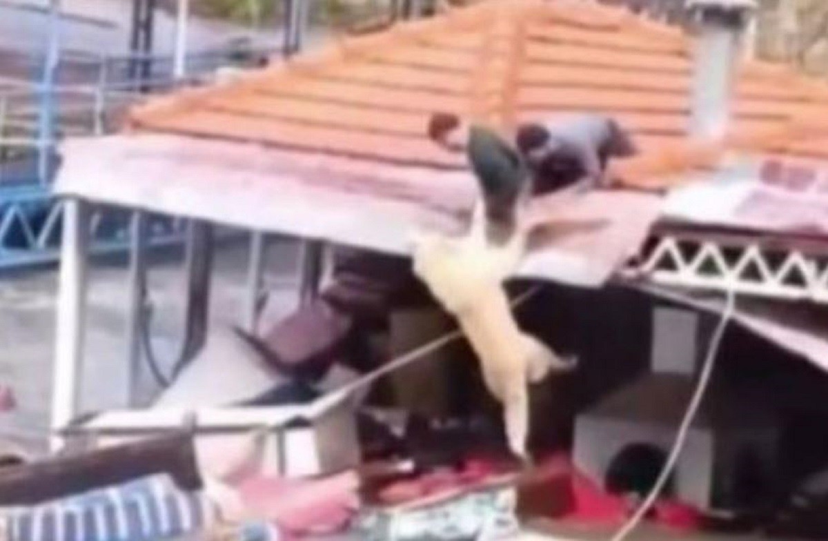 Στο βίντεο της διάσωσης, δύο άνδρες φαίνονται να προσπαθούν να σώσουν τον σκύλο, τραβώντας τον από τα πόδια για να τον μεταφέρουν σε ασφαλές σημείο, ώστε να μην κινδυνέψει από πνιγμό.