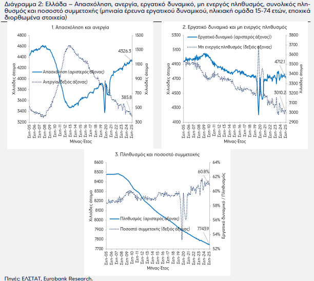 Η Eurobank αναλύει τα δεδομένα απασχόλησης και ανεργίας της τελευταίας 20ετίας, καταδεικνύοντας ότι οι άνεργοι είναι μειωμένοι κατά 21,9 χιλ. άτομα σε σύγκριση με το χαμηλό επίπεδο του Μαΐου 2008, ενώ οι απασχολούμενοι παραμένουν χαμηλότεροι κατά 294,0 χιλ. άτομα σε σχέση με το υψηλό του Απριλίου 2008. Αυτή η διαφορά υπογραμμίζει τη μείωση του εργατικού δυναμικού που προήλθε από την πολύχρονη οικονομική κρίση. Παρά ταύτα, παρατηρείται μια ανατροπή στην πτωτική τάση του πληθυσμού μετά την πανδημία, με τη συρρίκνωση του μη ενεργού πληθυσμού να συνεχίζεται.