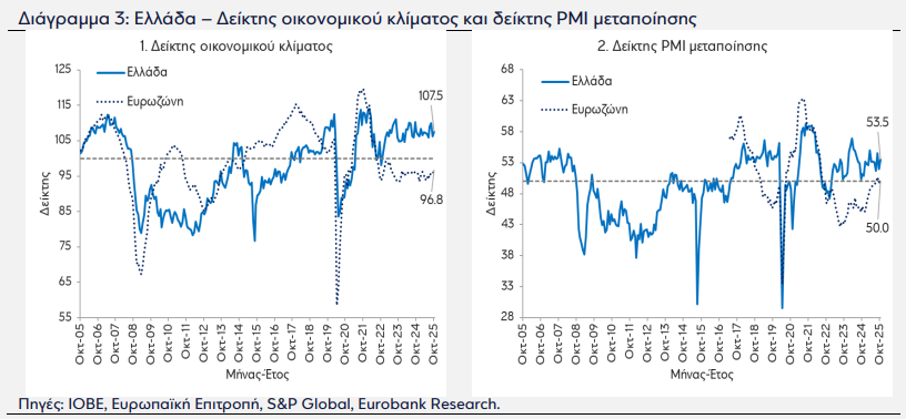 Επιπλέον, οι δείκτες οικονομικού κλίματος και PMI μεταποίησης εξακολουθούν να παραμένουν σε υψηλά επίπεδα, με αύξηση τον Οκτώβριο του 2025. Συγκεκριμένα, ο δείκτης οικονομικού κλίματος του ΙΟΒΕ ανήλθε στις 107,5 μονάδες, ενώ ο δείκτης PMI μεταποίησης της S&P Global κατέγραψε πρόοδο στις 53,5 μονάδες, αποτέλεσμα που ενισχύεται από τη ζήτηση στην εσωτερική αγορά. Ωστόσο, ο δείκτης καταναλωτικής εμπιστοσύνης παραμένει σε χαμηλά επίπεδα, με περισσότερες αρνητικές απαντήσεις στις σχετικές έρευνες.