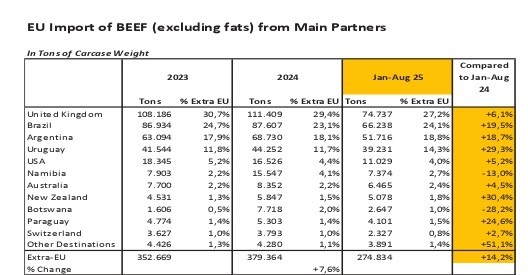 Η Βραζιλία, η Αργεντινή και η Ουρουγουάη είναι οι κυριότεροι προμηθευτές βοδινού κρέατος προς την ΕΕ (μετά το Ηνωμένο Βασίλειο) και μια πιθανή αύξηση των εισαγωγών θα μπορούσε θεωρητικά να μειώσει τις τιμές. Ωστόσο, αυτό δεν φαίνεται πιθανό.