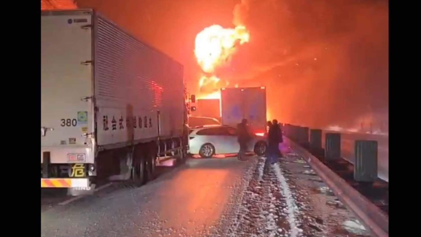 Η έντονη χιονόπτωση που επικρατούσε την ώρα του ατυχήματος καθιστούσε την κυκλοφορία ιδιαίτερα επικίνδυνη, σύμφωνα με τα τοπικά μέσα ενημέρωσης.
