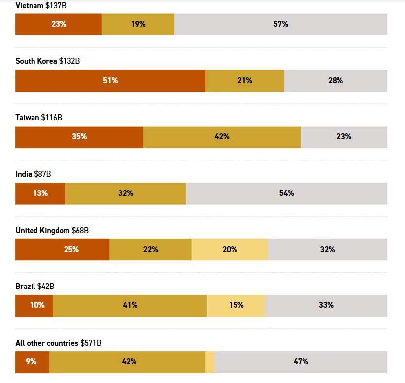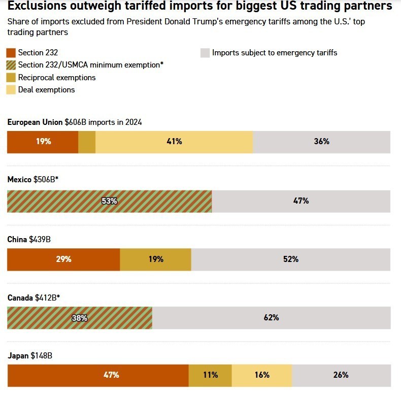 Ωστόσο, οι περισσότερες από τις εξαιρέσεις από τους λεγόμενους «ανταποδοτικούς» δασμούς —που ανέρχονται στο ελάχιστο 10% για τις περισσότερες χώρες— δεν συνδέονται με νέες εμπορικές συμφωνίες, σύμφωνα με την ίδια ανάλυση.