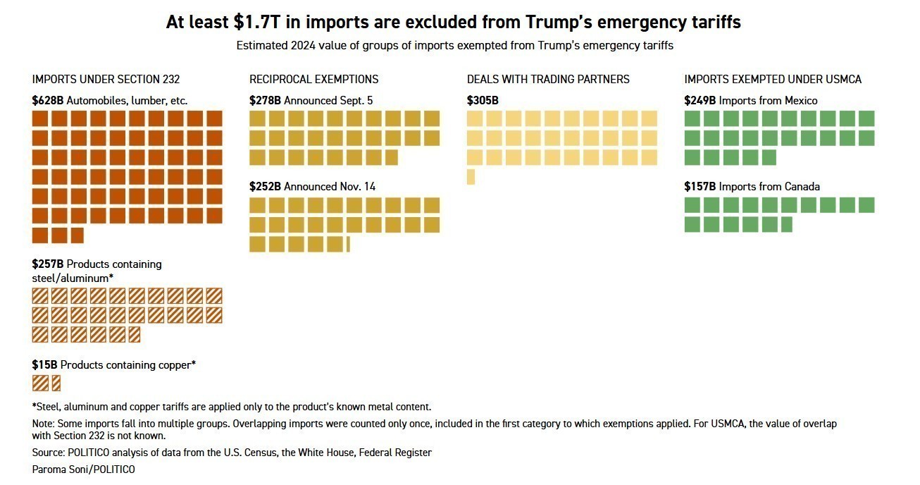 Όπως αναφέρει ανάλυση του POLITICO, που βασίζεται στα στοιχεία εισαγωγών του προηγούμενου έτους, περίπου 1,6 τρισ. δολάρια σε ετήσιες εισαγωγές επιβαρύνονται με δασμούς, ενώ τουλάχιστον 1,7 τρισ. δολάρια είναι αδασμολόγητα ή υπάγονται σε άλλες κατηγορίες δασμολόγησης. Οι εξαιρέσεις σε χιλιάδες προϊόντα ενδέχεται να υπονομεύσουν τις προσπάθειες του Τραμπ να ενισχύσει την αμερικανική μεταποίηση και να επιτύχει τη μείωση του εμπορικού ελλείμματος.