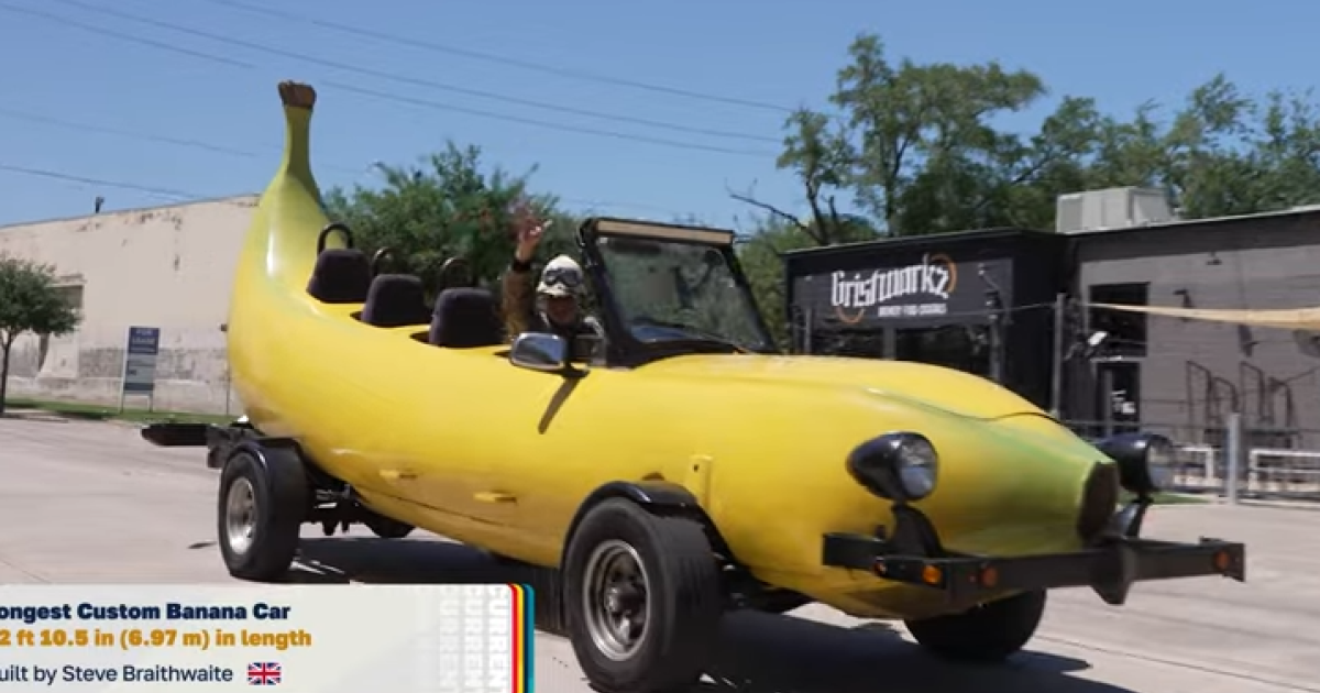 Το Braithwaite Cavendish Four Seat Velos-a-Nana, γνωστό και ως “The Big Banana Car”, είναι και επίσημα το μακρύτερο αναγνωρισμένο μπανάνα-αυτοκίνητο στον κόσμο, σύμφωνα με το Guinness World Records 2026.