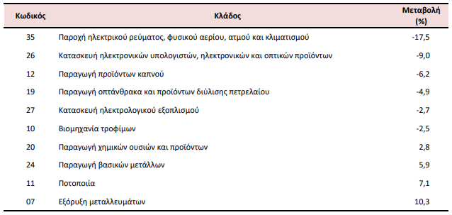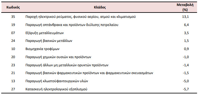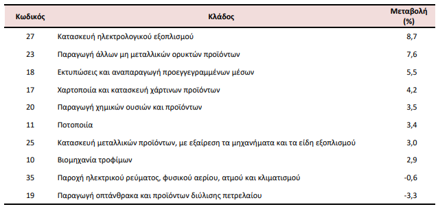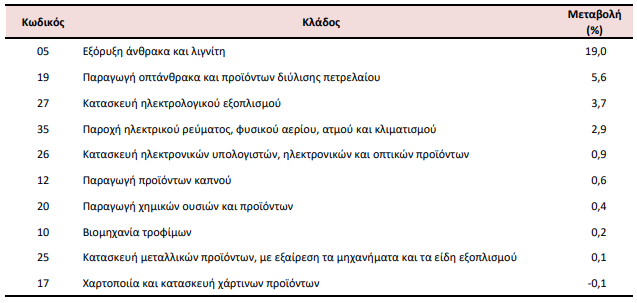 Η αύξηση αυτή προήλθε κυρίως από τις μεταβολές που καταγράφηκαν στους διψήφιους κλάδους της ταξινόμησης NACE Αναθ. 2, όπως φαίνεται στον παρακάτω πίνακα: