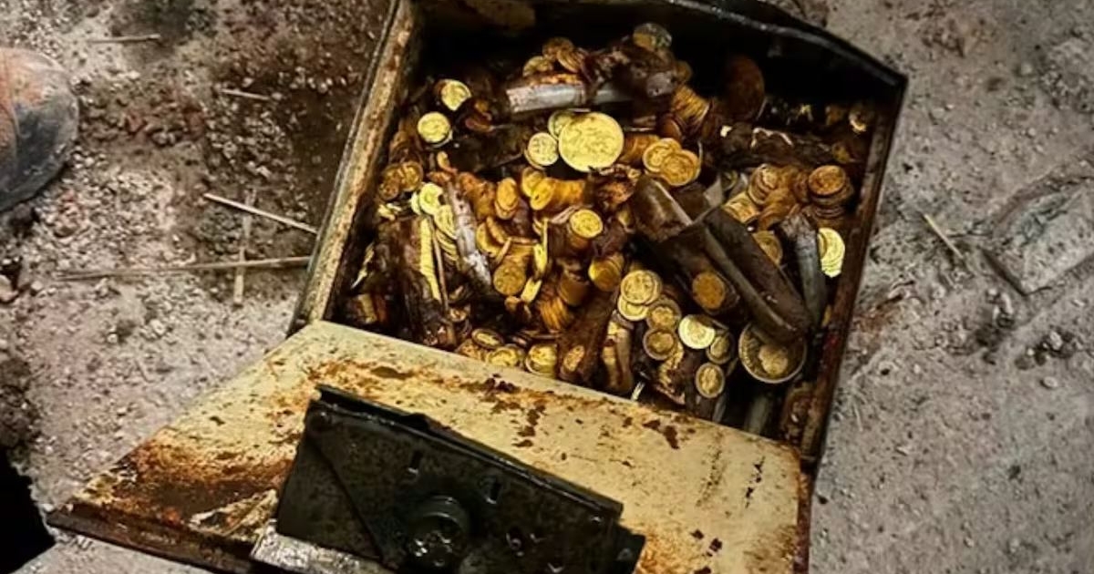 Το σχοινί συνδεόταν με ένα παλιό μεταλλικό σεντούκι, το οποίο, όταν άνοιξε, αποκάλυψε περίπου 30 κιλά χρυσών νομισμάτων. Η αξία τους εκτιμάται γύρω στα 2 εκατομμύρια ευρώ, κατατάσσοντας την ανακάλυψη αυτή ανάμεσα στις πιο εντυπωσιακές στην Ευρώπη τα τελευταία χρόνια.